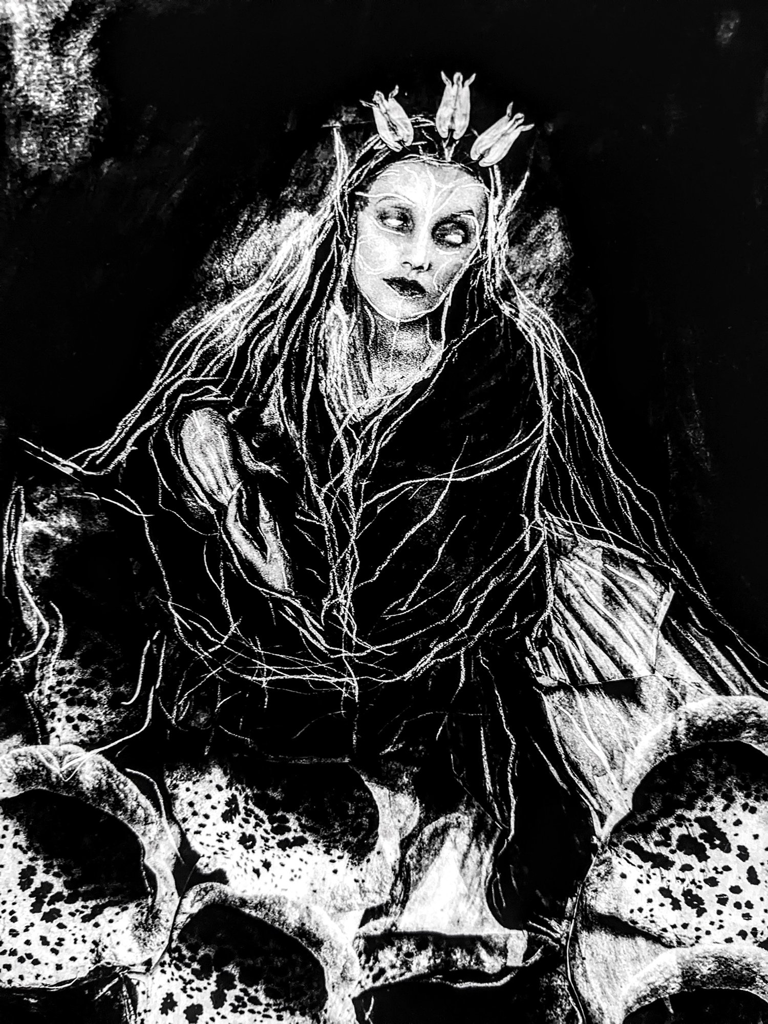 Faery Queen with a foxglove gown and a crown of bleeding hearts.