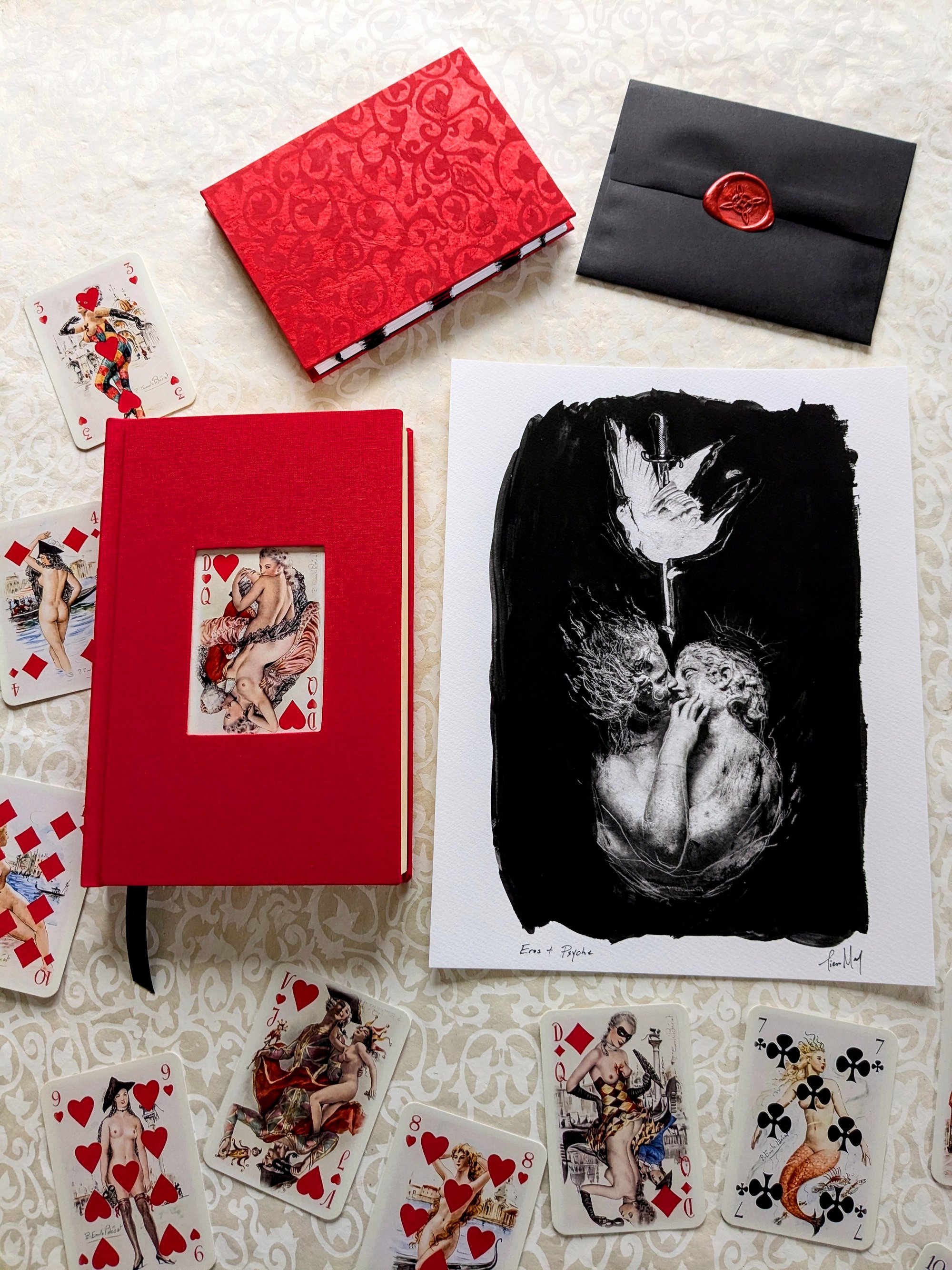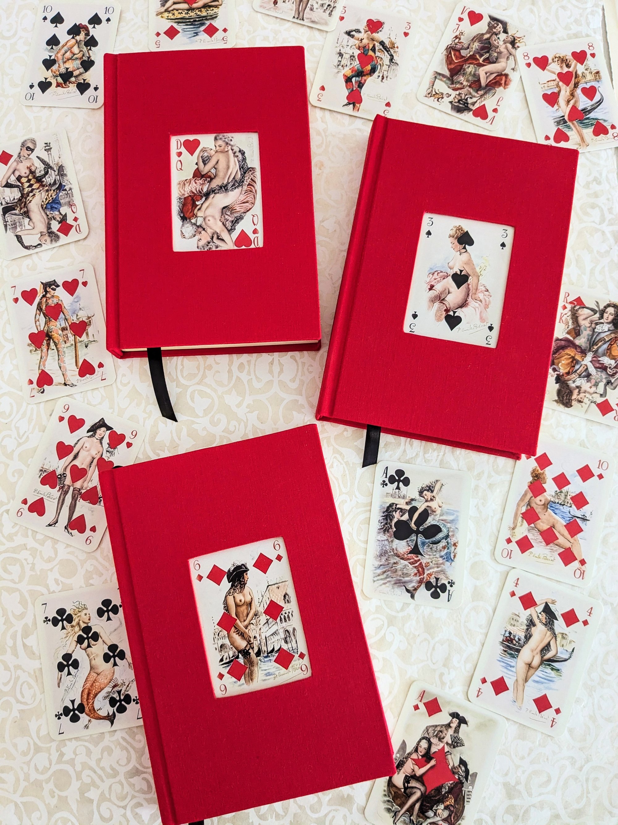 This will be the first of many limited edition releases in collaboration with Wyrd Wit, my sister’s custom bookbinding and editing house. She has magically transformed trade paperback copies of Nin’s erotic masterpiece into exquisite hardbound editions, each cover featuring an adorable vintage playing card from Mémoires de Casanova by French painter Paul-Émile Bécat.